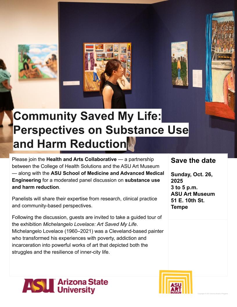 Please join the Health and Arts Collaborative — a partnership between the College of Health Solutions and the ASU Art Museum—along with the ASU School of Medicine and Advanced Medical Engineering for a moderated panel discussion on substance use and harm reduction. Panelists will share their expertise from research, clinical practice and community-based perspectives. Following […]